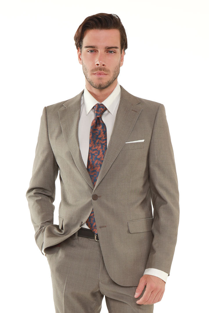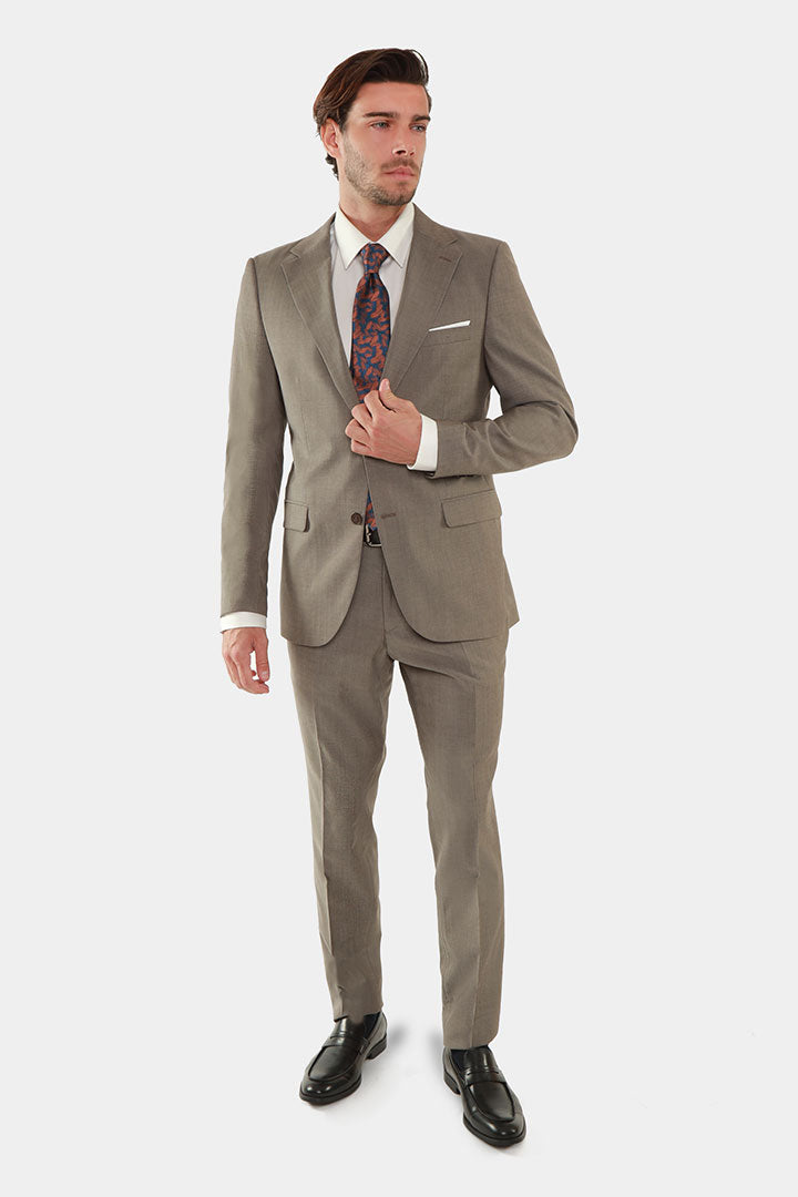 Make a lasting impression with the DKS Signature Brownish Grey Tailored Suit, an exclusive piece for those who prefer understated sophistication. Crafted in a tailored slim fit, it features a 2-button closure, dual vents, and is made from 100% WV 130’s fine wool, ensuring comfort and elegance throughout the day. The rich brownish grey tone combined with a subtle self-pattern weave offers a refined twist on classic formalwear. Whether it’s a business conference or evening event, this suit delivers sharp style with contemporary edge. High-resolution image available to showcase its quality and fit.